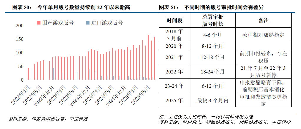 从版号审批周期看,今年最快已缩短至3个月以内,审批节奏更加稳定可预期。游戏版号申请需要经过出版社整理申报资料、省新闻出版局审批和国家新闻出版署审批三大步骤。此前曾经历两轮版号暂停,一轮是2018年机构改革,另一轮则是2021-2022年,版号暂停叠加2019-2020年申报的游戏版号较多,导致2021-2022年版号审批时间较长。2023年以来,在版号申报意愿略有下降、前期积压基本消耗、总署审批流程优化等多重因素驱动下,版号审批缩短至一年以内。今年最快3个月以内就能获批,且版号发放更加稳定、审批节奏更加可预期,从而使游戏厂商能更有节奏地开展游戏上线)this.width=500 align=center hspace=10 vspace=10 alt=