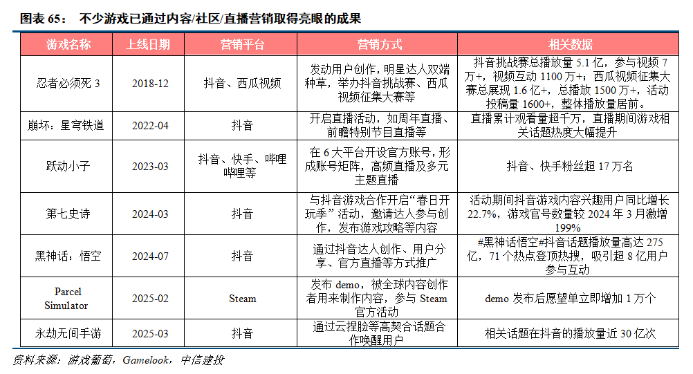 目前已经有不少游戏通过内容/社区/直播营销取得亮眼的成果。据2024年中国移动游戏广告营销报告,超80%的头部移动游戏已在微信视频号、抖音、快手、哔哩哔哩、TapTap等平台搭建官方账号,除发布游戏资讯以外,还开展活动、评论区互动,增强开发者与用户的交流。抖音方面,《永劫无间手游》通过抖音官方账号推出AI捏脸活动,相关线亿次;《崩坏:星穹铁道》在抖音开启一系列周年庆、前瞻特别节目等直播活动,直播累计观看量超千万。哔哩哔哩方面,腾讯《三角洲行动》成为B站游戏营销的典型案例,预热期间大量视频的播放量已超百万,公测阶段通过B站的内容、直播、投流等方式,将游戏用户总规模提升近2倍。