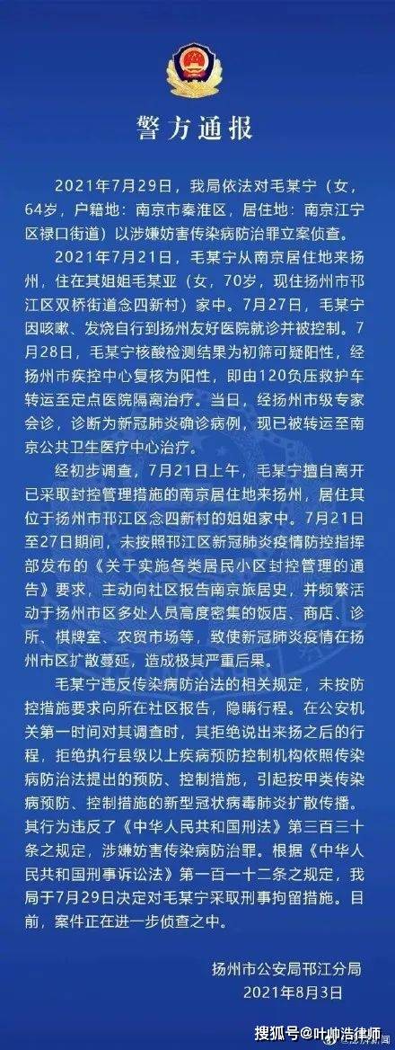 2026-01-18棋牌游戏,棋牌游戏平台,棋牌游戏APP下载8月3日,扬州市公安局邗江分局发布通报,7月29日,依法对毛某宁(女,64岁,江苏南京人)以涉嫌妨害传染病防治罪采取刑事拘留措施。毛某宁于7月21日从南京来到扬州,住在姐姐家中。21日至27日期间,毛某宁未主动向社区报告南京旅居史,并频繁活动于扬州市区多处人员高度密集的饭店、商店、诊所、棋牌室、农贸市场等,28日确诊。在公安机关对其调查时,其拒绝说出来扬之后的行程,致使疫情在扬州市区扩散蔓延,造成极其严重的后果涉嫌妨害传染病防治罪。毛某宁已被运至南京定点医院治疗。案件正在进一步侦查之中。