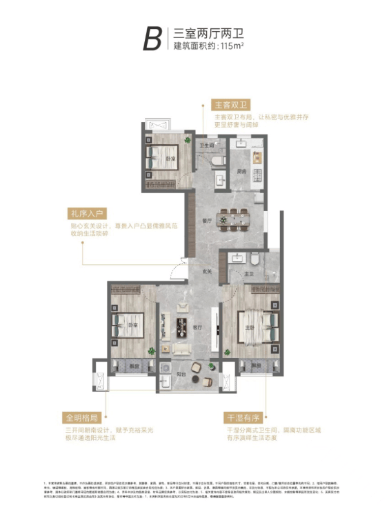 三居室健康户型面向改善家庭,建筑面积适中,空间布局开阔合理,注重健康舒适度与功能性的平衡。户型采用动静分区设计,公共活动区域与私密休息区域严格分离,公共区域(客厅、餐厅、厨房)连通南向全景阳台,形成开阔的通风采光廊道,让自然风贯穿室内,保持空气流通;客厅与餐厅空间开阔,能够容纳多人活动,同时预留了健身区域,方便业主在家锻炼;阳台不仅是休闲观景空间,还可改造为阳光健身区、绿植区,进一步丰富健康生活场景。私密区域的三个卧室均为全明设计,采光通风良好,主卧套房设计,配备独立卫生间与衣帽间,独立卫生间采用干湿分离设计,且带有窗户,自然通风减少异味与细菌;衣帽间采用透气材质,避免衣物潮湿发霉。两个次卧空间宽敞,采光充足,可分别作为儿童房与长辈房,儿童房临近主卧,方便照顾,且窗户设置防护栏,保障安全;长辈房远离公共活动区域,安静舒适,且采光充足,有利于长辈身心健康。厨房采用 U 型布局,操作空间充足,储物能力强,配备环保橱柜与台面,减少甲醛等有害物质释放;厨房与餐厅之间设置了移门,有效阻隔油烟扩散。公共卫生间干湿分离,配备优质卫浴洁具与通风设施,满足家庭日常使用需求。